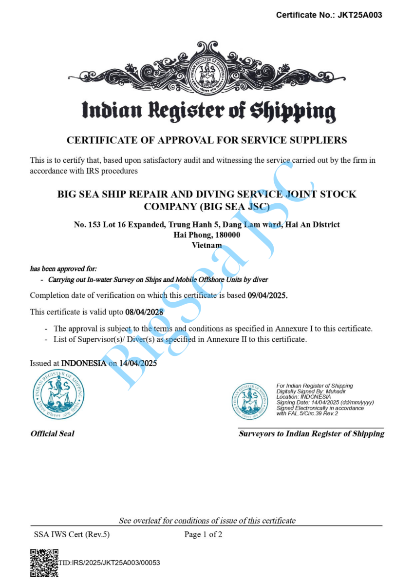 BigSEA JSC proudly holds the Diving Certificate issued by the Indian Register of Shipping (IRS) – one of the world’s leading classification societies. With this certification, BigSEA demonstrates professional capability in underwater ship services, inspection, and hull cleaning, meeting international safety and quality standards. We are committed to providing safe, efficient, and cost-effective solutions for shipowners worldwide.