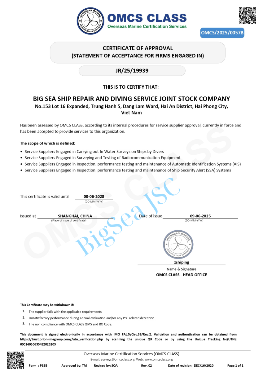 BIG SEA JSC is approved by OMCS class for under water service and Radio communication Equipment