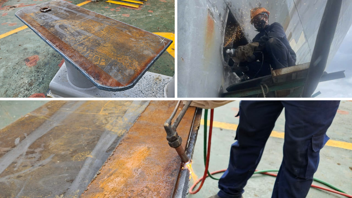 Skilled workers used advanced cutting equipment to completely remove the damaged plate. A new steel plate was then fabricated on-site, cut precisely to match the dimensions and contours of the affected area. This step required a high degree of accuracy to ensure a perfect fit with the vessel’s hull structure.