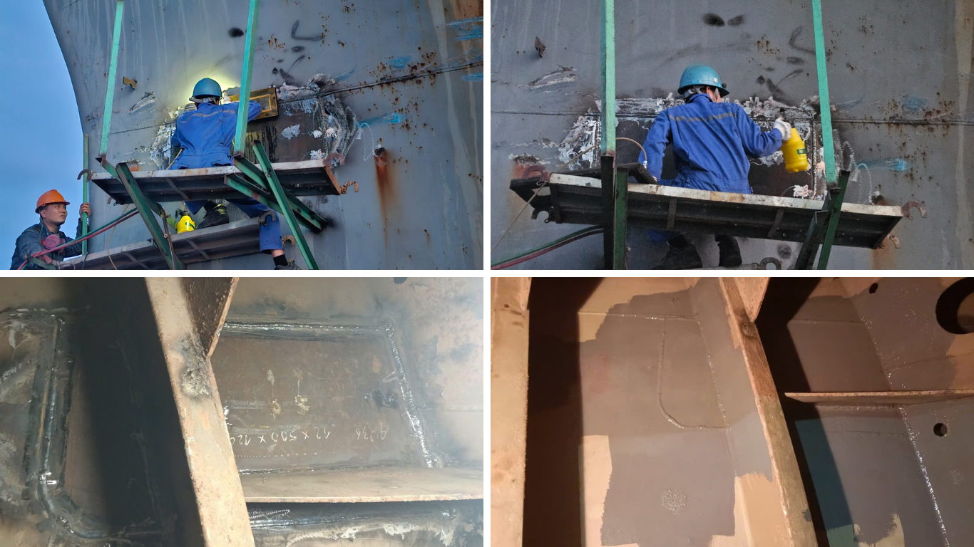 After welding was completed, the vessel underwent NDT testing to confirm watertightness. Once the results met the standards, the repaired area was coated with multiple layers of anti-corrosion paint, protecting the hull from the harsh effects of seawater and weather conditions.