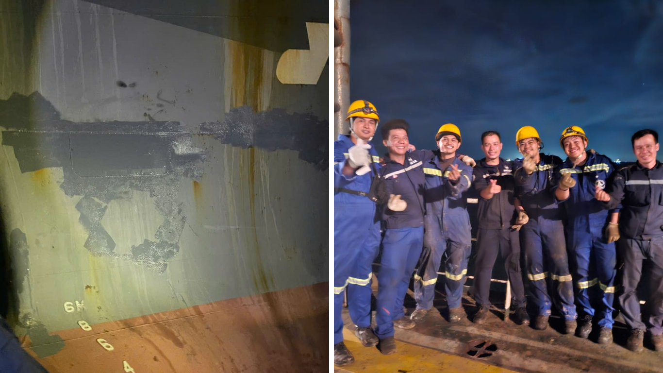 The entire repair process was executed in strict compliance with international safety standards: from cutting out the damaged plate, fabricating a new steel plate matching the ship’s size and structure, to welding, conducting watertightness testing, and applying anti-corrosion surface treatment. All procedures were carried out by highly skilled shipyard workers, using modern specialized equipment.